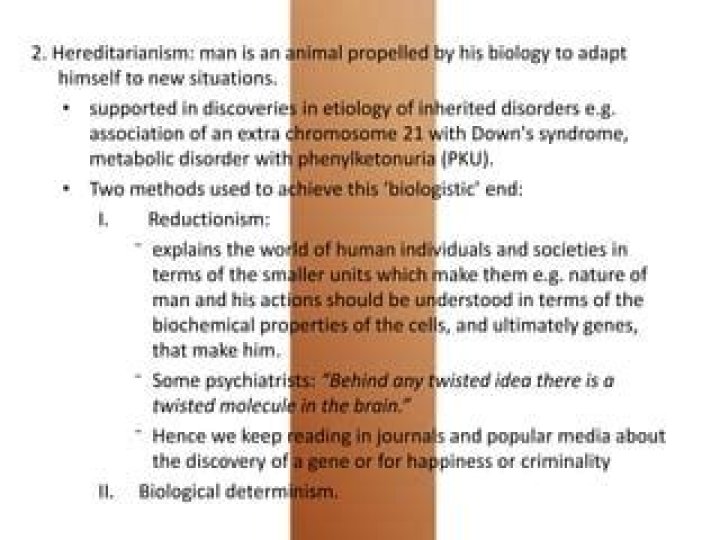 Hereditarianism is a concept that states that the traits observed in the organisms are totally dependent on genes. Hereditarianism ignores the environmental factors and emphasizes that genetic inheritancegenetic inheritance Heredity, also called inheritance or biological inheritance, is the passing on of traits from parents to their offspring; either through asexual reproduction or sexual reproduction, the offspring cells or organisms acquire the genetic information of their parents. › wiki › Heredity