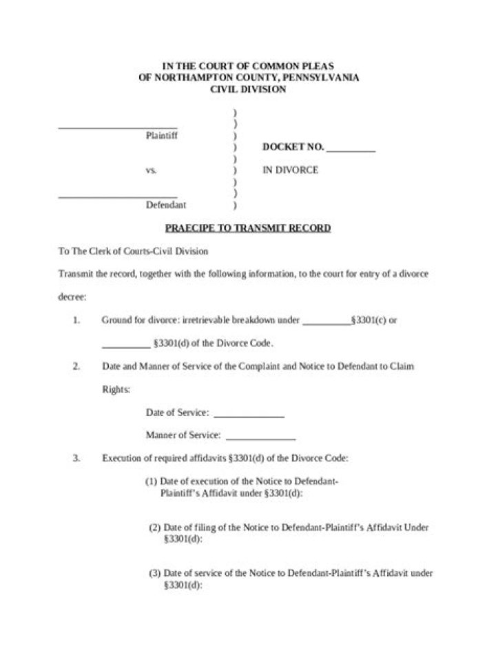 THE PRAECIPE TO TRANSMIT RECORD. ... , the other party can request the court to enter a final decree in divorce or, if there are unresolved ancillary claims, an order approving grounds for divorce as indicated on the proposed Praecipe to Transmit Record, which is attached.