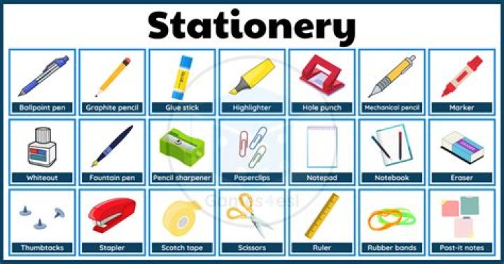 • Stationery including pens, pencils, highlighters and folders.